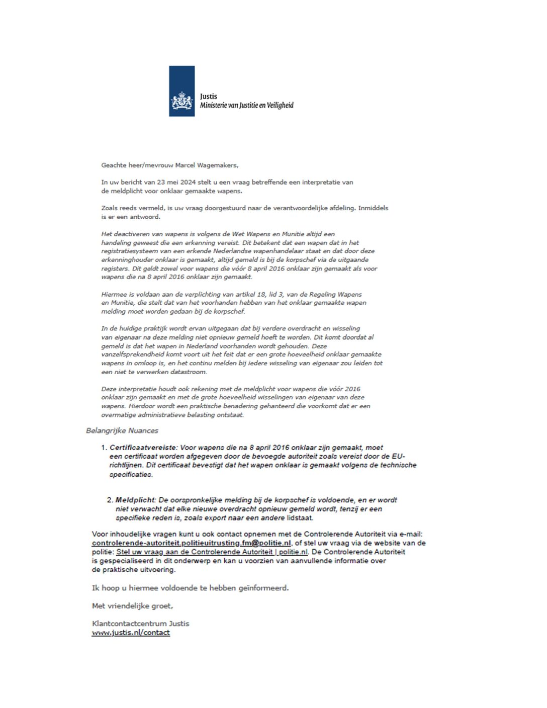 Vanwege de ontstane verwarring hebben wij deze interpretatie van de meldplicht voorgelegd aan Justitie. Wij kregen daarop een bevestigend antwoord en hebben voor u dit antwoord bijgevoegd in de afbeeldingen. (Cursief gedrukt leest u onze vraag, daaronder onder het kopje belangrijke nuances de bevestiging)