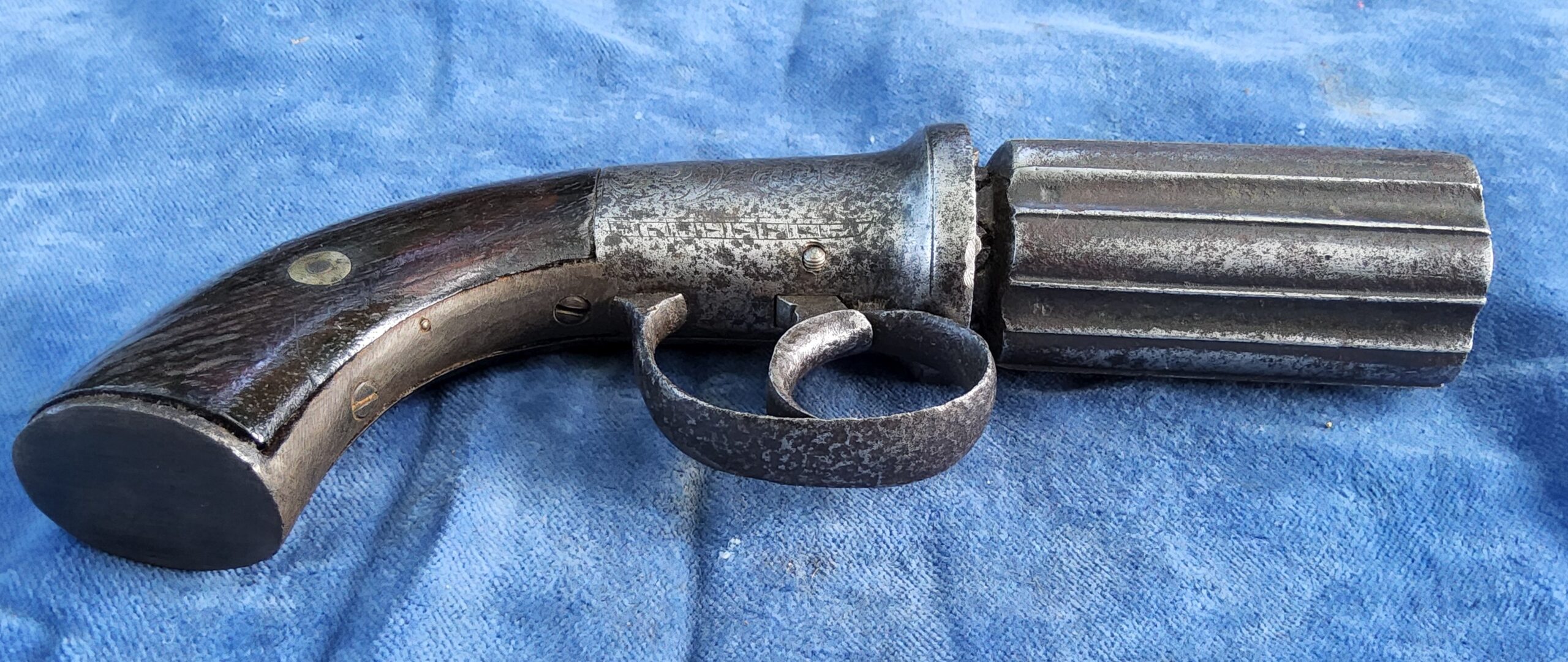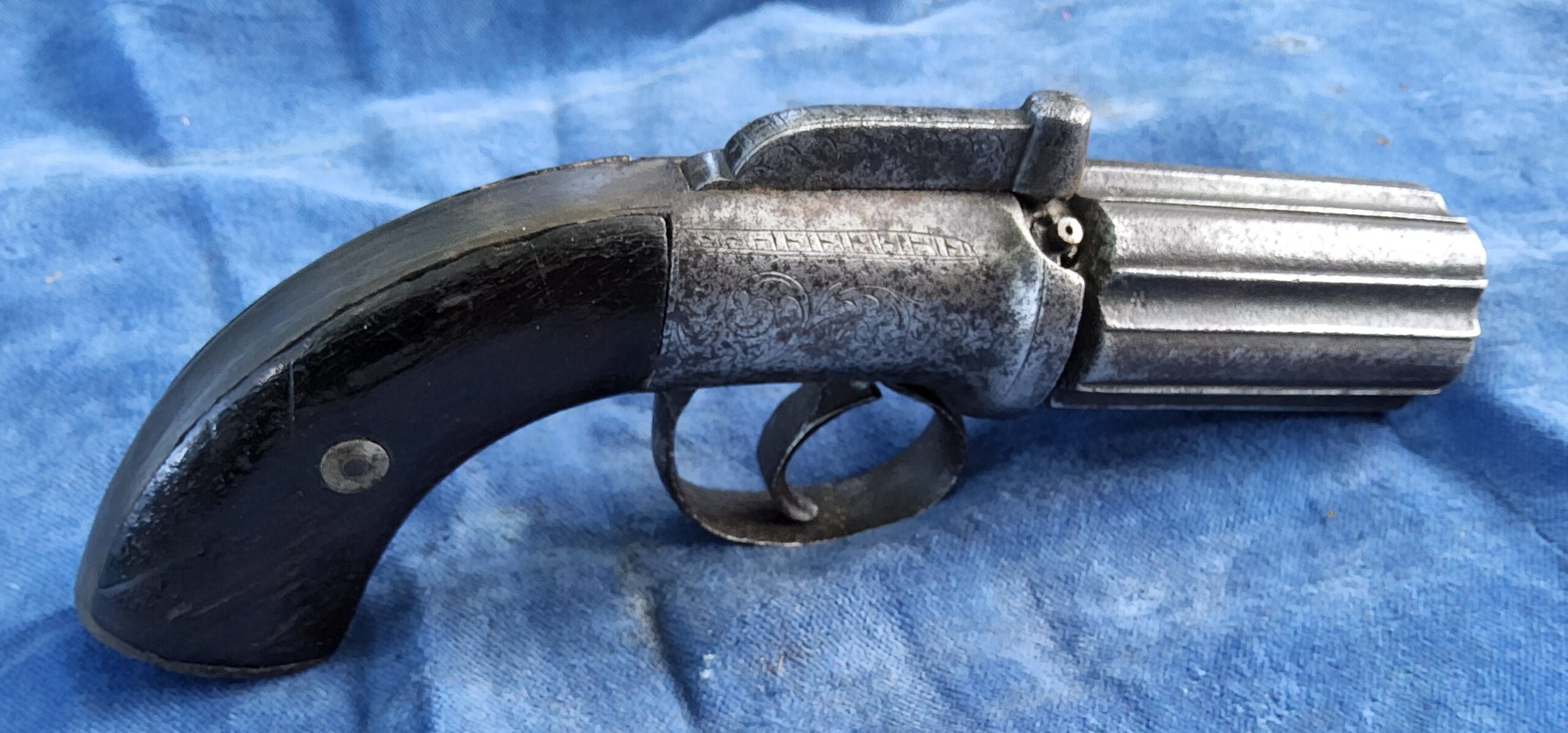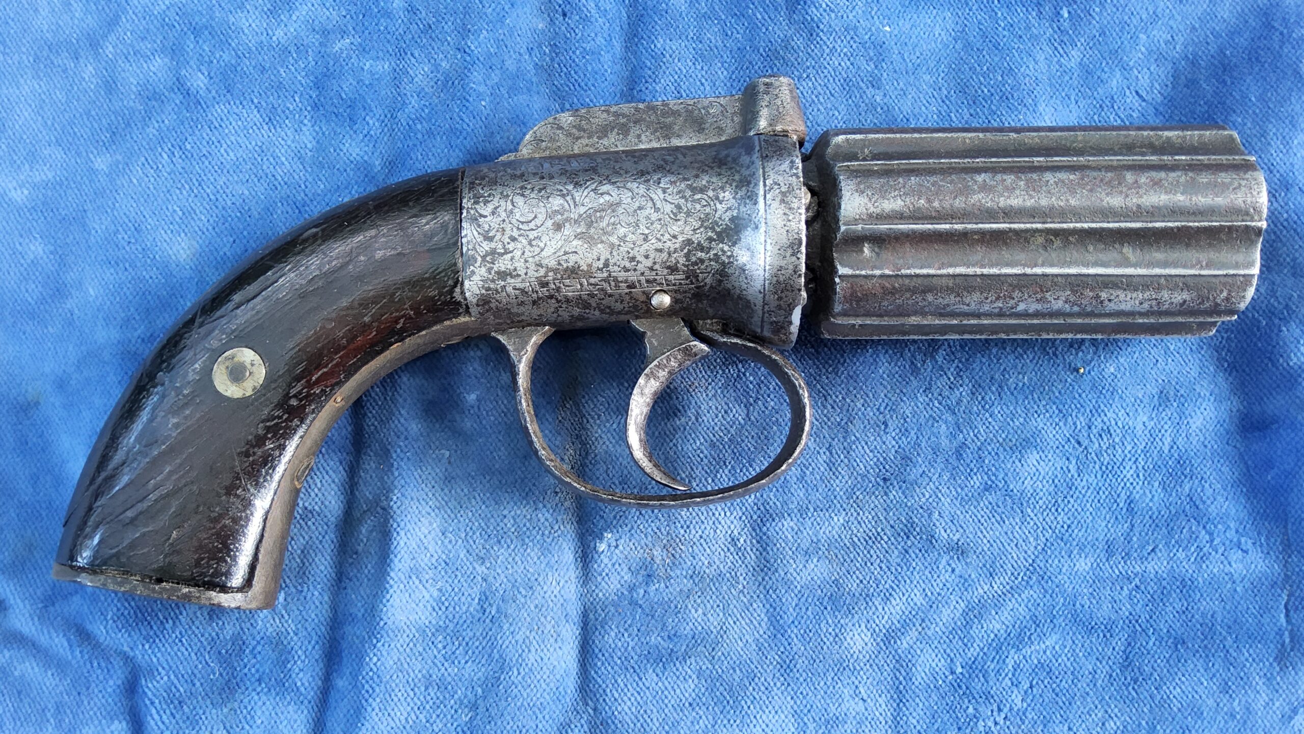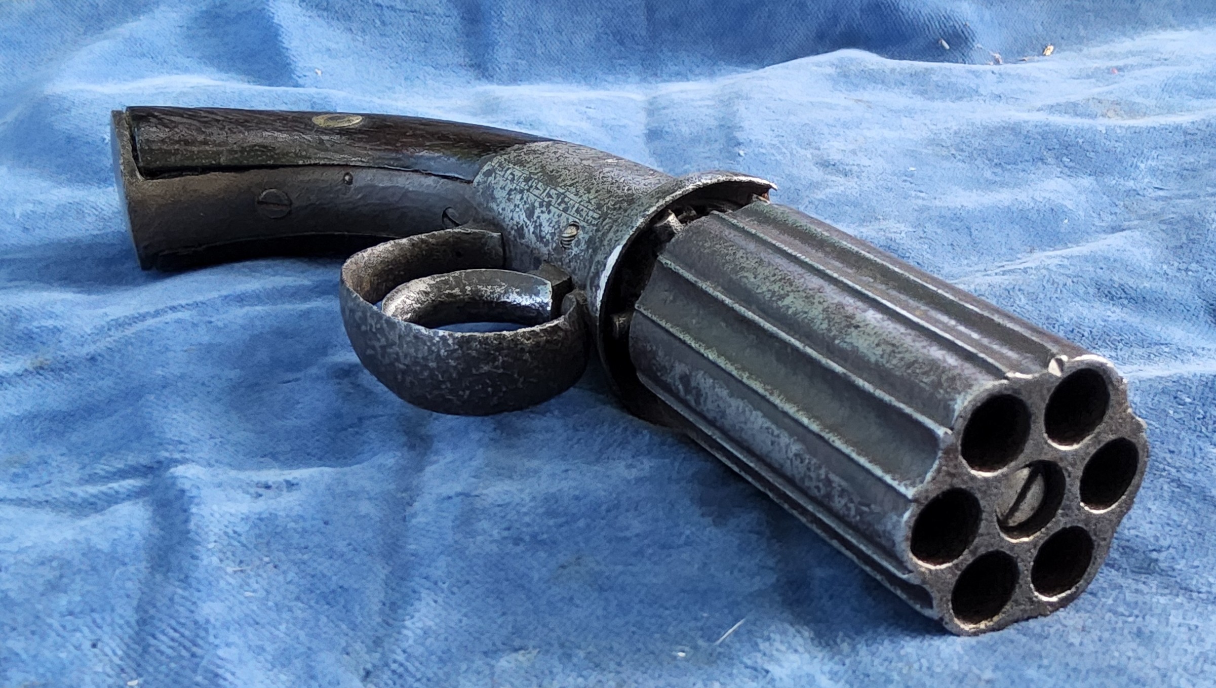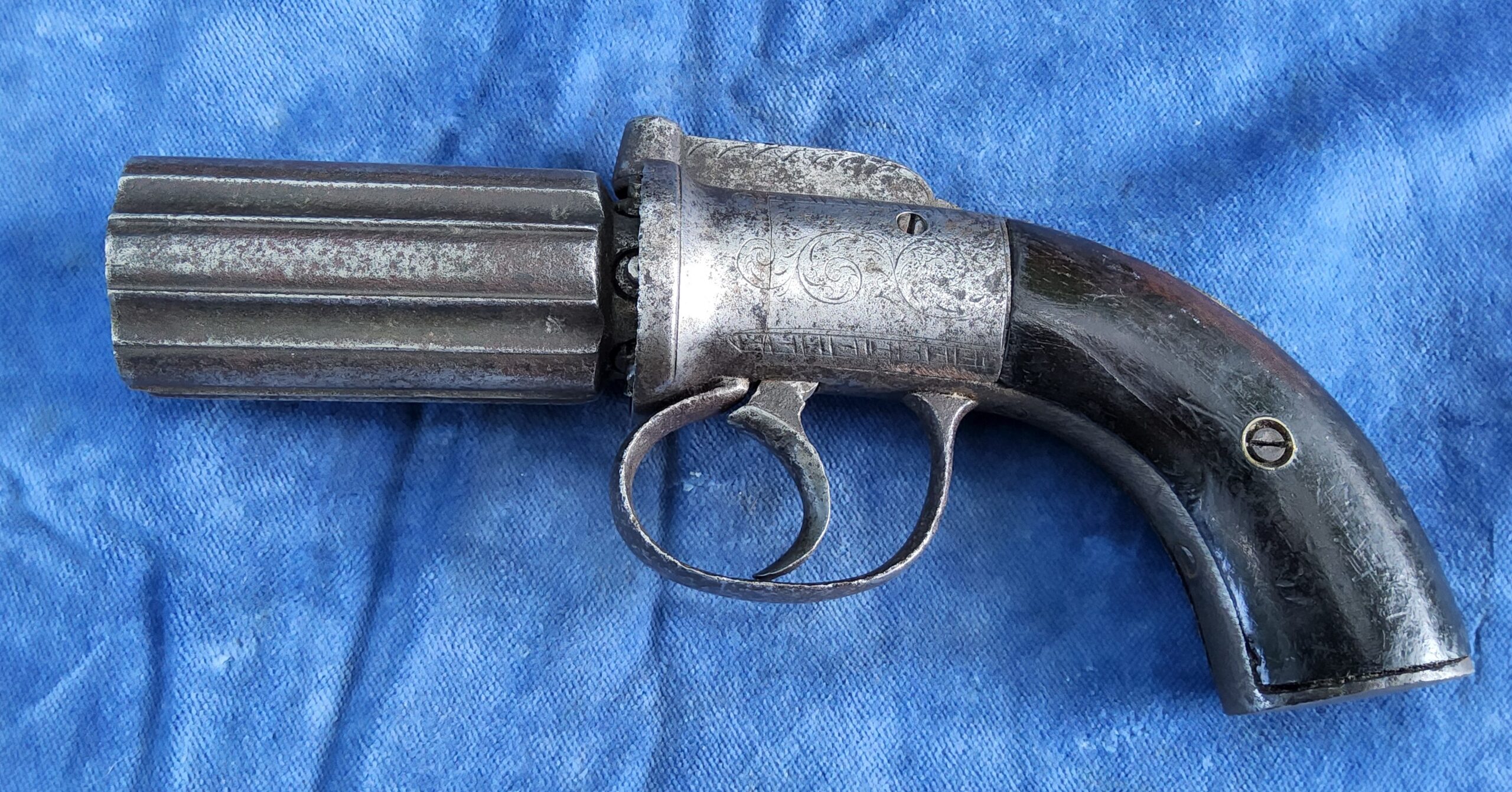Te koop staat hier een aardige originele 6 schots pepperbox in kaliber 10 mm percussie.